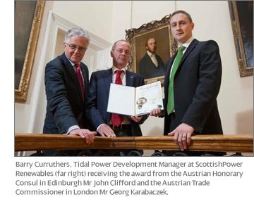 The award was presented to Barry Carruthers, Tidal Power Development Manager at ScottishPower Renewables, by the Austrian Honorary Consul in Edinburgh Mr John Clifford and the Austrian Trade Commissioner in London Mr Georg Karabaczek.