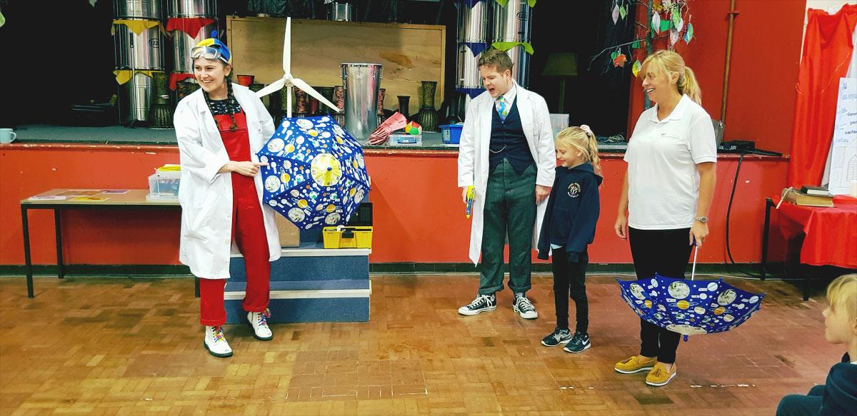 Brought to life by two actors from the Theatr, a ‘normal’ school science workshop is suddenly interrupted by Professor Sparky and his niece Erica. Erica wants to be a professor but so far has failed all her STEM exams. With the aid of the pupils completing various, high-energy problem-solving tasks, games and experiments, the two challenge the class to help Erica pass her exam.